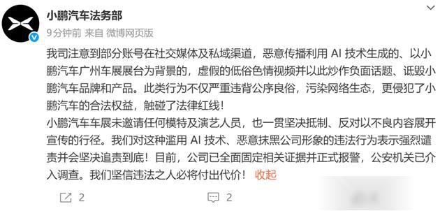 小鹏汽车表示,车展未邀请任何模特及演艺人员,也一贯坚决抵制、反对以不良内容展开宣传的行径,对这种滥用AI技术、恶意抹黑其公司形象的违法行为表示强烈谴责并会坚决追责到底。目前,小鹏汽车已全面固定相关证据并正式报警,公安机关已介入调查。